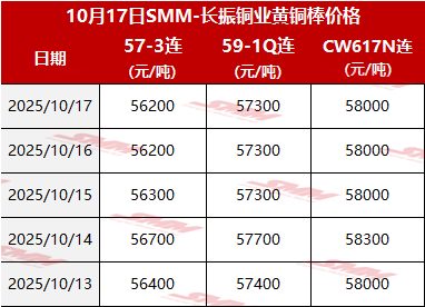 【SMM价格】2025年10月17日长振黄铜棒价格