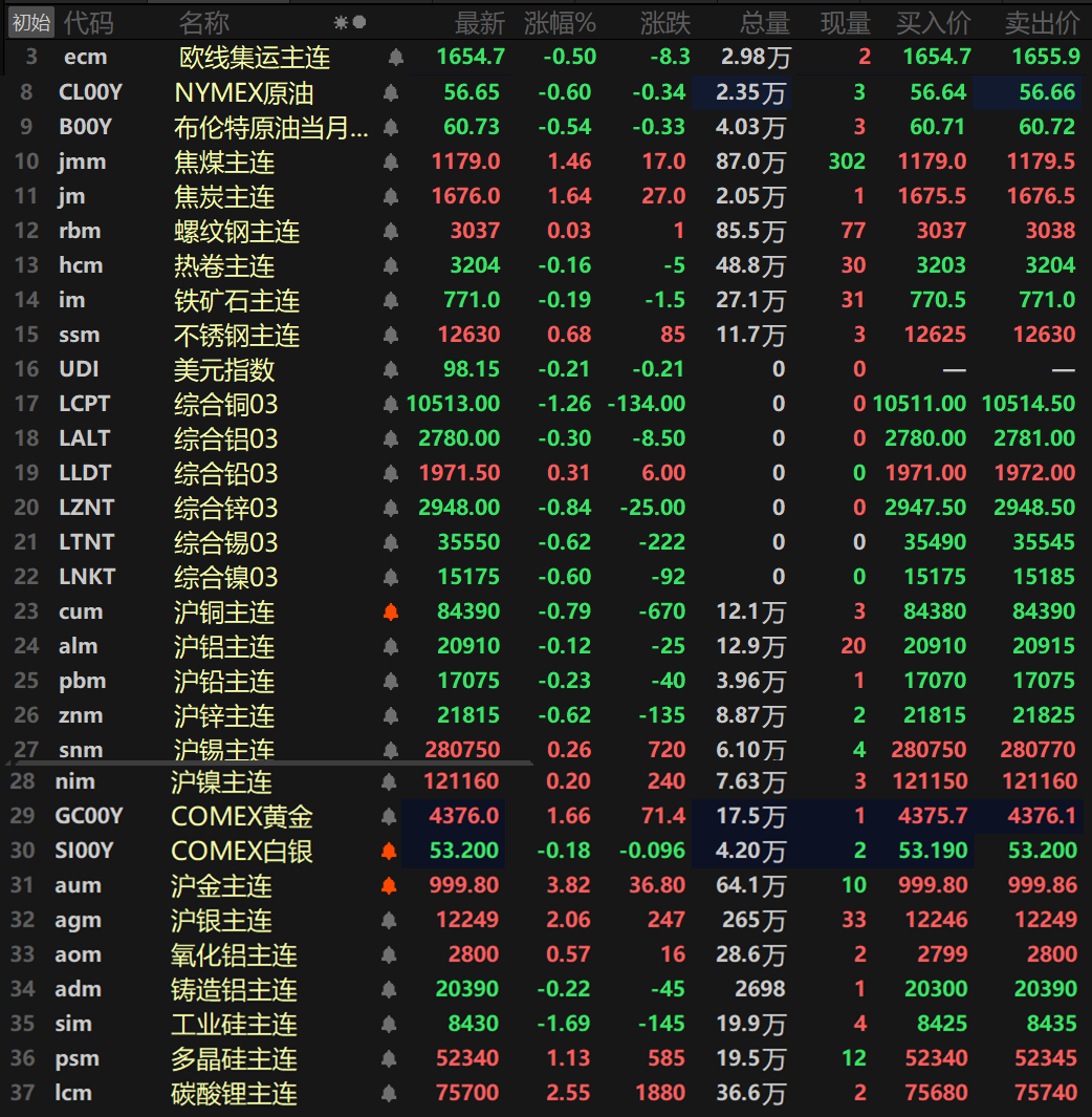 此外,碳酸锂主连涨2.55%,录得两连涨;多晶硅涨1.13%,录得五连阳。工业硅跌1.69%,欧线集运主连跌0.5%报1654.7。