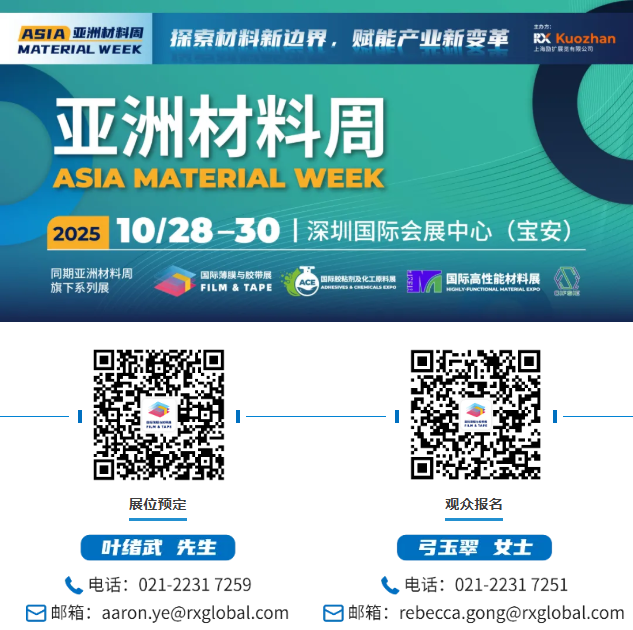 亚洲材料周(ASIA MATERIAL WEEK)由励展博览集团主办,覆盖主题展:深圳国际薄膜与胶带展、深圳国际胶粘剂及化工原料展、国际高性能材料展和第十二届中国国际氟硅材料工业及应用展览会,将于2025年10月28-30日在深圳国际会展中心举办,展会旨在为面向光电显示、消费电子、 汽车、半导体及通信、 家用电器、新能源、印刷包装等高附加值行业的技术研发和采购负责人的参展商,提供展示最新产品及技术、高效对接头部客户,推动材料工艺创新应用及践行绿色可持续发展理念的一站式商贸平台,打造立足中国,辐射整个亚洲的“亚洲材料周”。