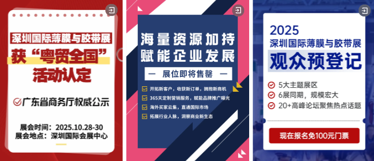 各位产业采购达人、技术控、跨界玩家注意啦!10 月 28-30日,作为全球功能性薄膜与胶粘带以及涂布模切产业链的 “晴雨表”——2025 深圳国际薄膜与胶带展(FILM & TAPE EXPO 2025)将在深圳国际会展中心(宝安新馆)10&12&14号馆盛大启幕,诚邀您莅临参观!