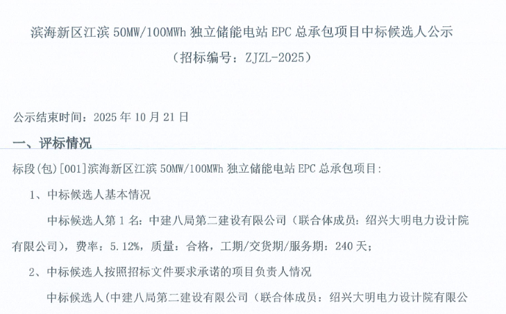 北极星储能网获悉,10月16日,绍兴滨海新区滨耀储能有限公司发布滨海新区江滨50MW/100MWh独立储能电站EPC总承包项目中标候选人公示。中标候选人第一名为中建八局第二建设有限公司(联合体成员:绍兴大明电力设计院有限公司),投标费率5.12%,项目总投资12308.65万元,相当于投标报价11,678.44712万元,折合单价1.168元/Wh。