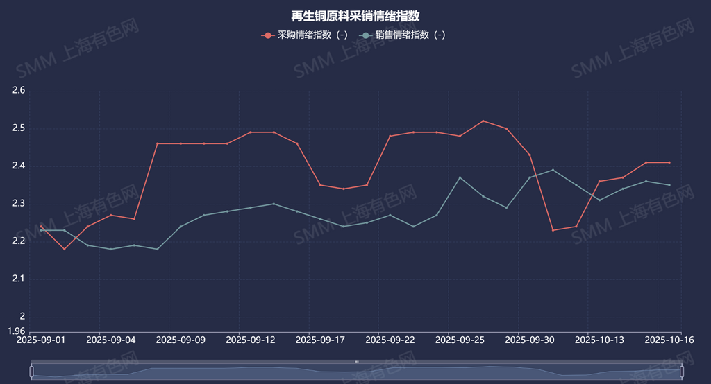 本周再生铜杆市场在铜价剧烈波动与政策不确定性的双重夹击下艰难运行。周内铜价呈现“大起大落”态势,截至周四跌幅达900元/吨,广东光亮铜价格随之回落至77200-77400元/吨,跌幅500元/吨。周初的剧烈波动导致再生铜原料贸易商和利废企业普遍选择观望,暂停采销活动以待价格企稳。本周采购情绪指数录得2.41,环比上升0.17,而销售情绪指数为2.35,环比持平,反映出市场参与者心态虽仍谨慎,但采购意愿已现微弱回暖。