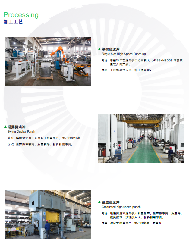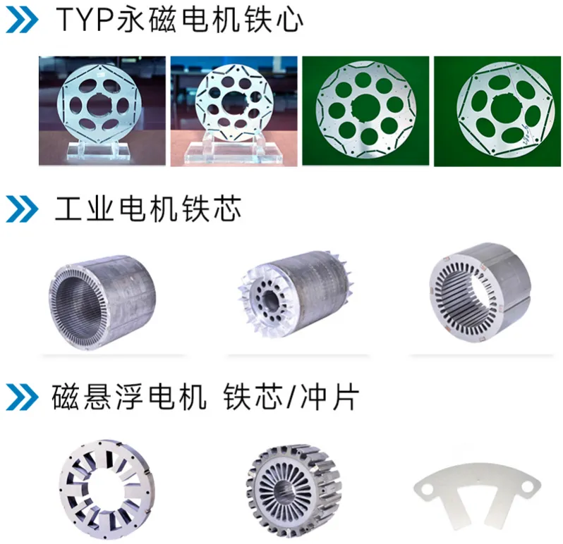 公司主要产品有:YE4、YBX4、TYP变频永磁电机系列、YE3、Y、Y2、Y3、YX3、YE2、、YB2、YB3;YKK、YKS、YPKK等高压电机系列;YZ、YZR、YD、YH电机系列;同步磁阻电机、新能源汽车电机、家用电器电机、曳引电机、扇形片、1~2.5MW的风力发电机及其他各种特种电机的定转子冲片和铁芯,产品广泛应用于军工、船舶、工业制造、家电、新能源汽车等领域,年冲裁矽钢片能力达10万吨以上。