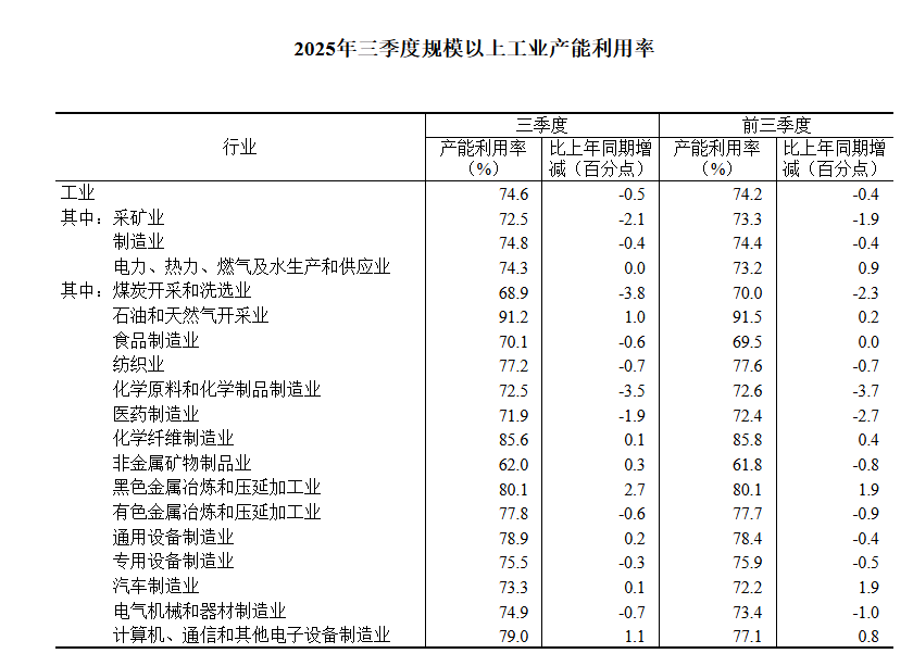 分主要行业看,2025年三季度,煤炭开采和洗选业产能利用率为68.9%,食品制造业为70.1%,纺织业为77.2%,化学原料和化学制品制造业为72.5%,非金属矿物制品业为62.0%,黑色金属冶炼和压延加工业为80.1%,有色金属冶炼和压延加工业为77.8%,通用设备制造业为78.9%,专用设备制造业为75.5%,汽车制造业为73.3%,电气机械和器材制造业为74.9%,计算机、通信和其他电子设备制造业为79.0%。