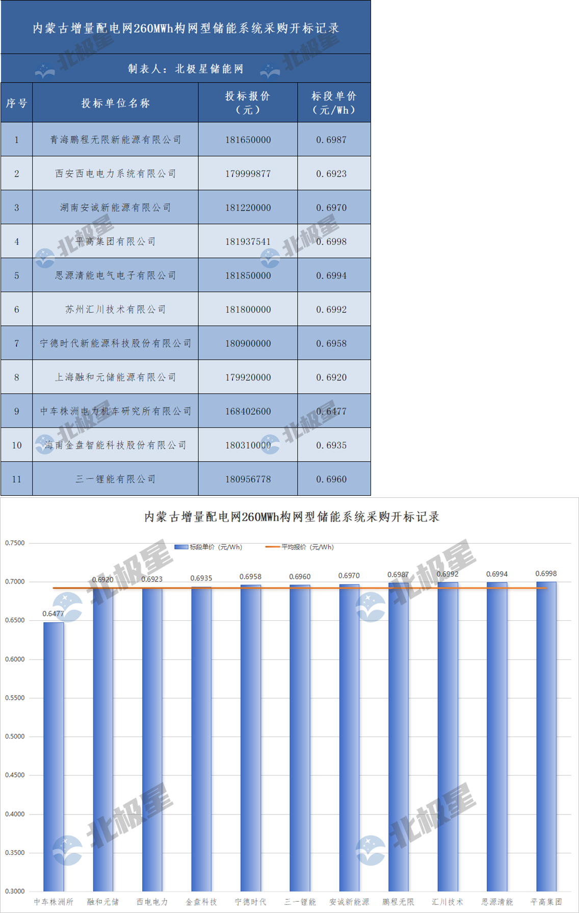 根据项目开标记录,共有鹏程无限、西电电力、安诚新能源、平高集团、思源清能、汇川技术、宁德时代、融和元储、中车株洲所、金盘科技、三一锂能11家企业参与竞标,投标单价范围为0.6477-0.6998元/Wh,平均报价0.6919元/Wh。
