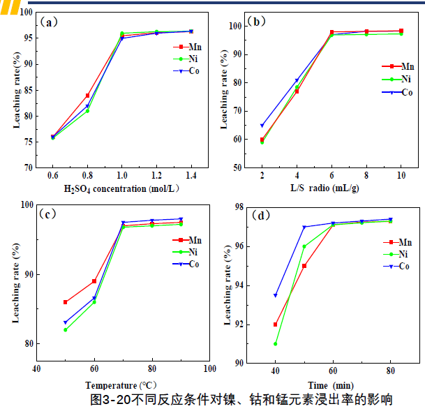 • 1 mol/L硫酸即可较高效率地实现对Ni、Co、Mn元素的浸取;