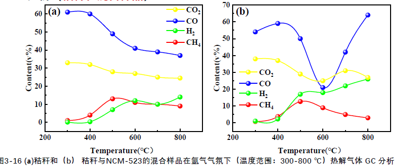 ►图(b) H2 含量高于图(a) ,说明NCM 正极材料促进了秸秆热解制氢。