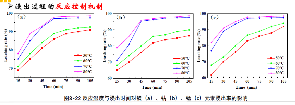 随着反应温度的提高和浸出时间的延⻓,三种有价金属的浸出率不断增大。另外,随着反应温度的提高,有价金属浸出率达到最大值所需要的浸出时间逐渐降低。当浸出时间超过60min 时,浸出率变化不大,这与上文图3-20(d)实验结果一致。