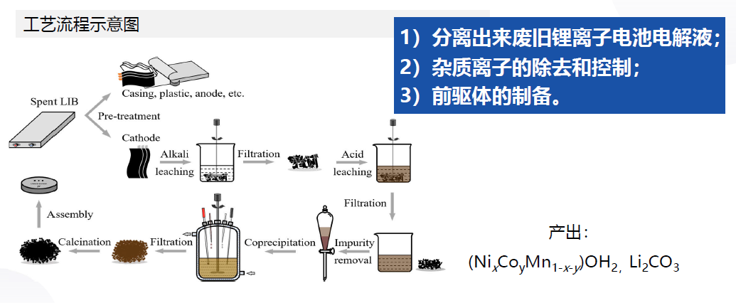 2) 废旧三元系动力锂离子电池的成套回收再利用技术,包括:电解液回收与分离,前驱体(NixCoyMn1-x-y) OH2,Li2CO3 产出;