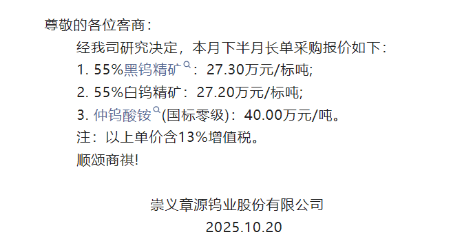 据崇义章源钨业10月20日消息:崇义章源钨业股份有限公司10月下半月的长单采购报价如下:1. 55%黑钨精矿:27.3万元/标吨,较上轮报价上调0.6万元/标吨;2. 55%白钨精矿:27.2万元/标吨,较上轮报价上调0.6万元/标吨;3. 仲钨酸铵(国标零级):40万元/吨,较上轮报价上调1万元/吨。