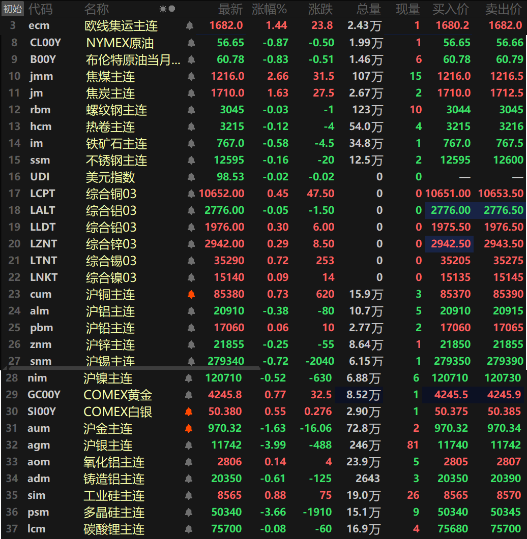 此外,碳酸锂主连跌0.08%,多晶硅主连跌3.66%,工业硅主连涨0.88%。欧线集运主连涨1.44%报1682。