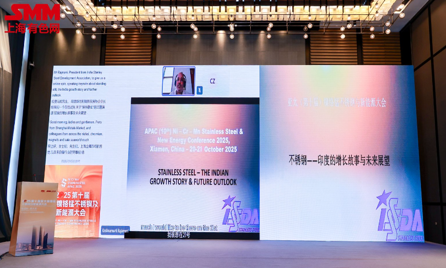 10月21日,在由上海有色网信息科技股份有限公司(SMM)主办的2025第十届亚太镍铬锰不锈钢及新能源大会上,印度不锈钢协会主席Mr.Rajamani Krishnamurtif分享了“不锈钢——印度的增长故事与未来展望”。