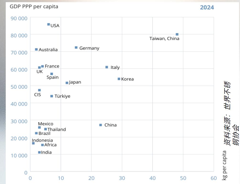 印度不锈钢人均购买力平价GDP已提升至3.4公斤,但在主要国家中仍处于最低水平。