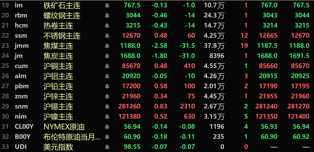 隔夜黑色系多飘绿,铁矿跌0.13%,不锈钢涨0.48%,螺纹钢跌0.46%,热卷跌0.43%。双焦方面:焦煤跌2.58%,焦炭跌1.8%。