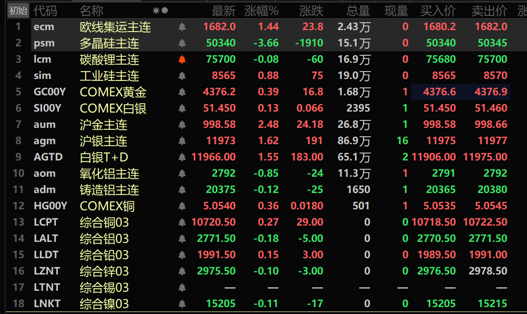 隔夜贵金属方面:COMEX黄金涨3.82%,盘中刷新历史新高4398美元/盎司;COMEX白银涨2.59%。隔夜沪金涨2.48%,沪银涨1.62%。