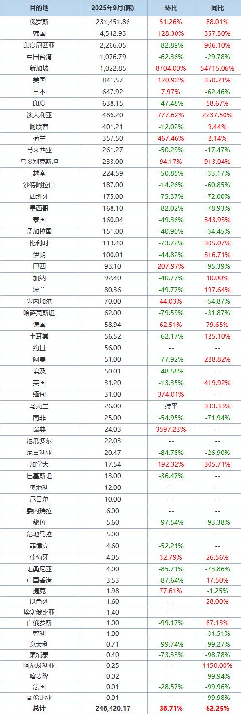 以下为根据中国海关总署官网数据整理的2025年9月氧化铝出口分项数据一览表: