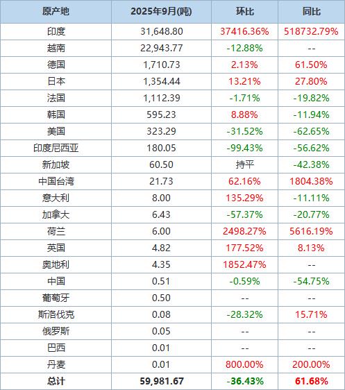 以下为根据中国海关总署官网数据整理的2025年9月氧化铝进口分项数据一览表: