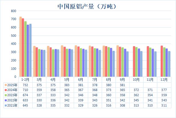 国家统计局发布报告显示,中国2025年9月原铝(电解铝)产量为381万吨,同比增加1.8%。9月国内电解铝运行产能小幅回升,电解铝厂铝水比例小幅回升,9月