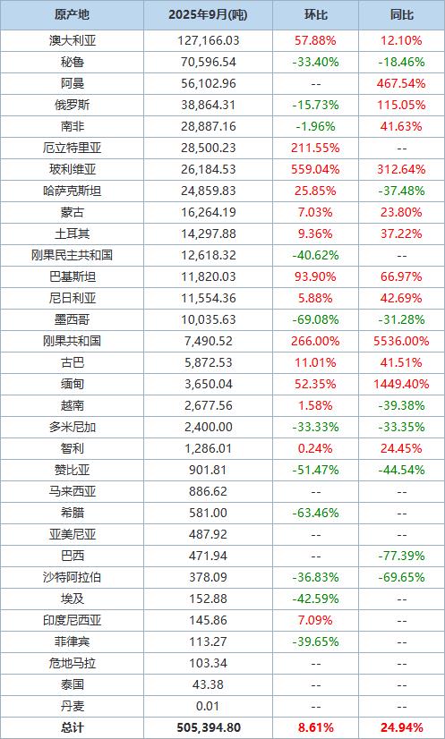 以下为根据中国海关总署官网数据整理的2025年9月锌矿砂及其精矿进口分项数据一览表:
