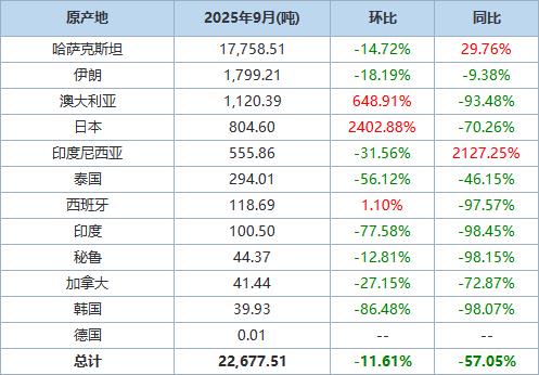 以下为根据中国海关总署官网数据整理的2025年9月精炼锌进口分项数据一览表:
