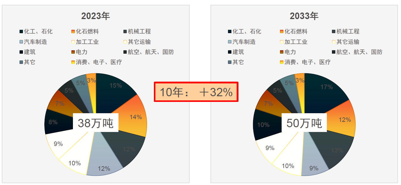2023-2033年预计钼消费发展趋势:分布均匀,领域多样,增长稳定、迅速。