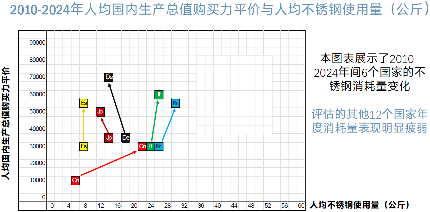 其对18个国家2024年人均GDP(购买力平价)与人均不锈钢使用量进行了介绍,并表示:实现目标人均不锈钢使用量将创造另外600万吨的新需求。