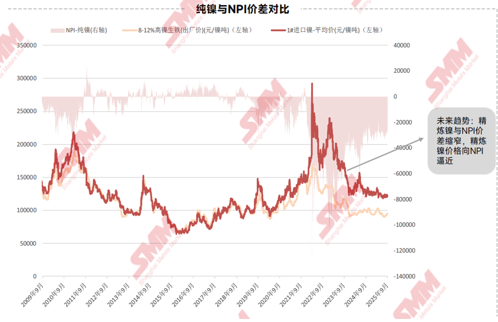 其结合纯镍与NPI价差对比分析预判未来趋势:精炼镍与NPI价差缩窄,精炼镍价格向NPI逼近。