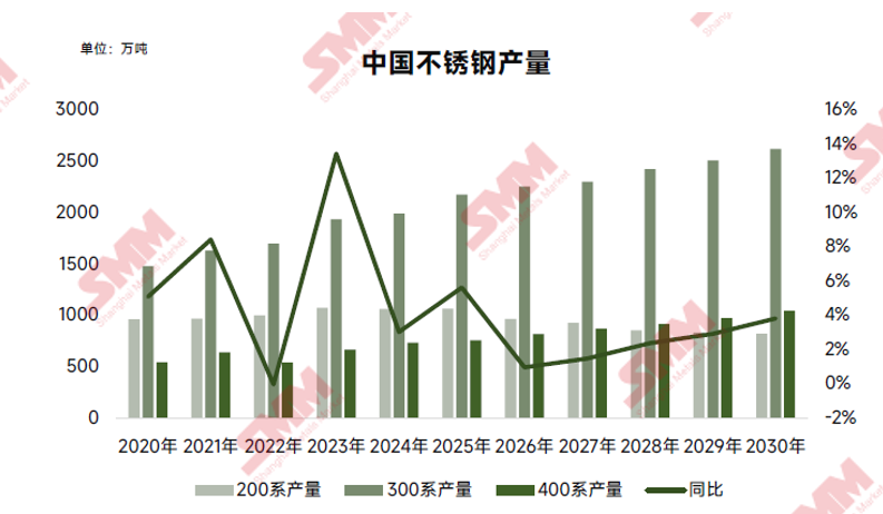 其从全球不锈钢分型号产量(2018-2030E)、全球不锈钢原料使用量等角度进行了分析。