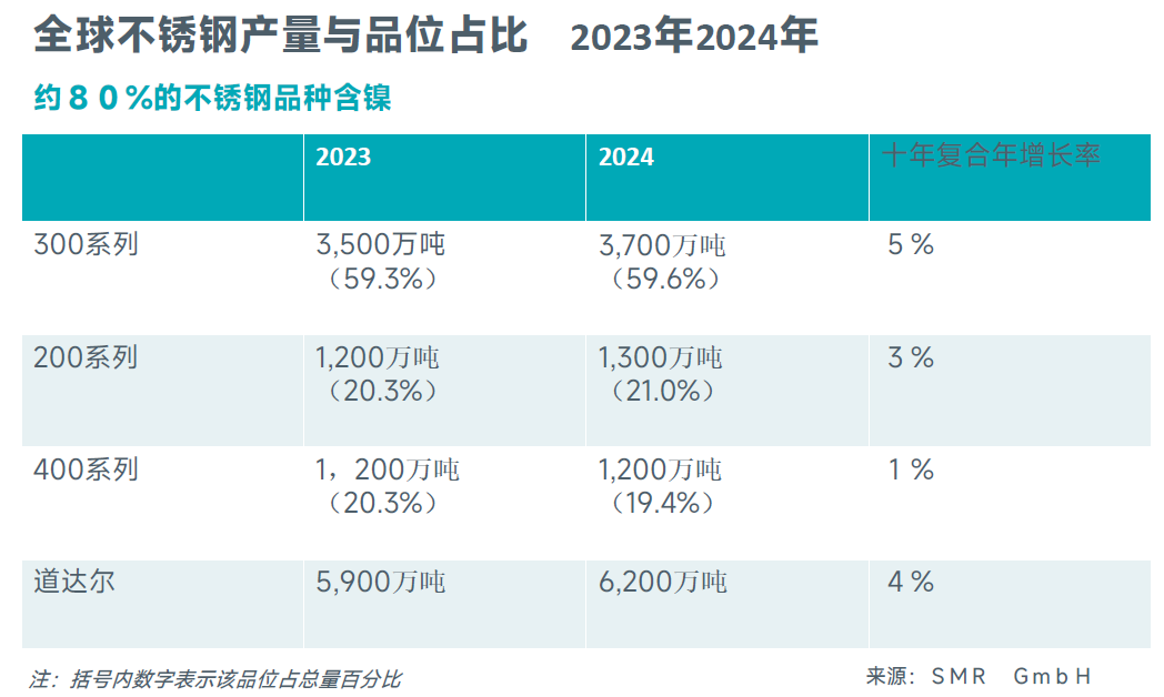 2024年全球不锈钢粗钢产量约为6,260万吨;较上年增长7%;十年复合年增长率约4%。