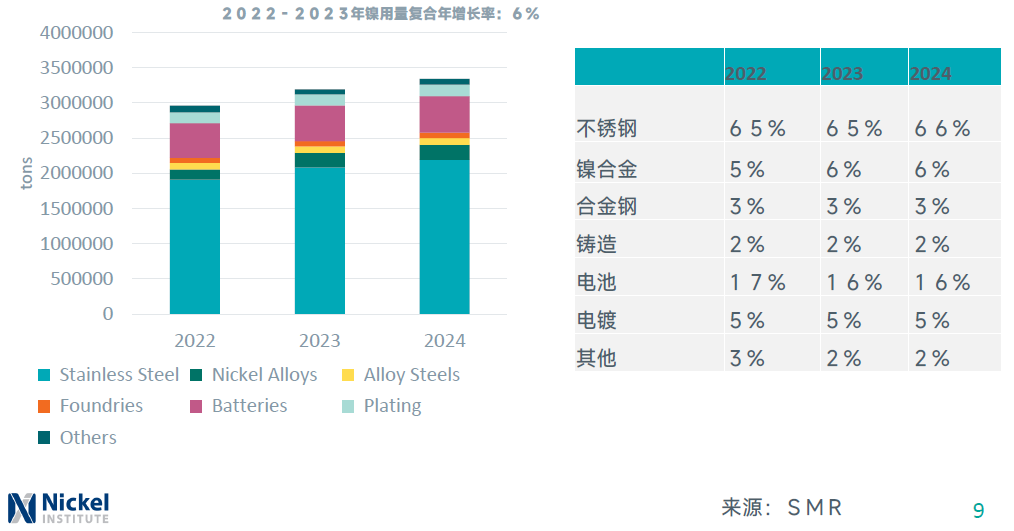不锈钢仍是镍的主要使用领域,其次是电池;镍用量的复合年增长率为6%,但过去几年各首次使用领域的相对份额保持稳定。