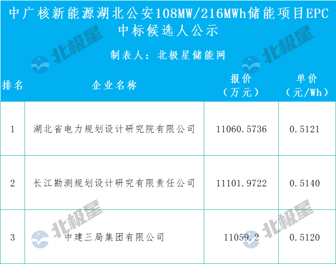 第一中标候选人为湖北省电力规划设计研究院有限公司,投标报价11060.5736万元,折合单价0.5121元/Wh;