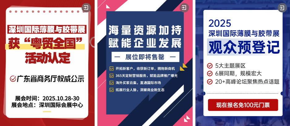 2025深圳国际薄膜与胶带展,不仅是一场展示产业创新成果的盛会,更是一次推动行业交流合作、引领产业未来发展的重要平台。金秋10月,诚挚邀请全球功能性薄膜厂、胶带厂、OCA光学胶、偏光片、触控显示、数码电子、汽车、印刷标签、涂布模切、塑料包装、锂电池、3C家电、半导体、PCB/FPC线路板等行业的企业家、技术专家、采购商及行业同仁们10月28-30日莅临深圳国际会展中心(宝安新馆)10&12&14号馆,共同探索产业创新机遇,共话行业发展未来!