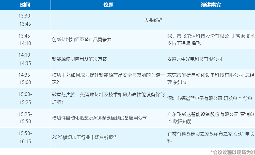 5、2025第三届新能源模切工艺及关键材料研讨会:聚焦新能源等领域的模切工艺技术创新与关键材料应用,分享模切工艺优化方案与材料选型经验,提升新能源模切产品的质量与性能。