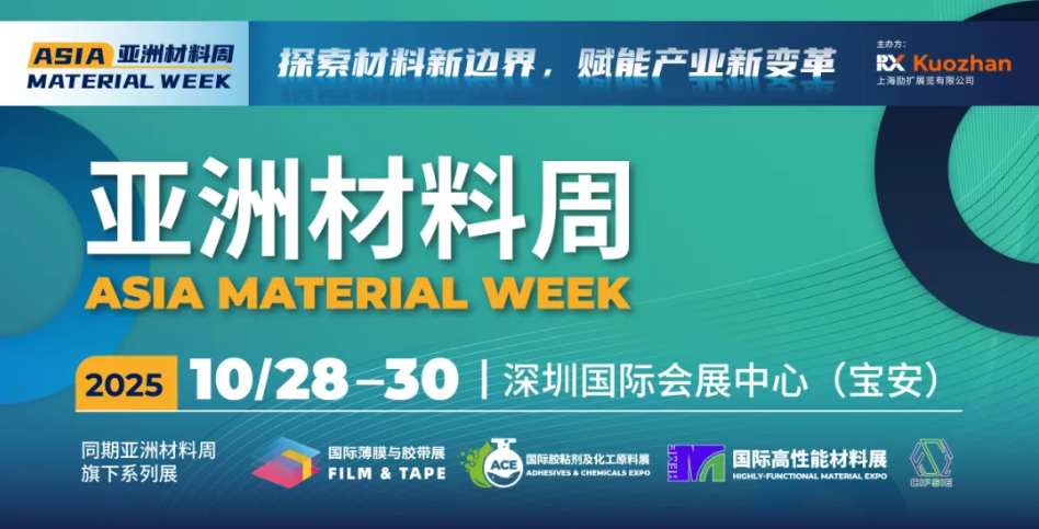 亚洲材料周(ASIA MATERIAL WEEK)由励展博览集团旗下上海励扩展览有限公司主办,覆盖主题展:深圳国际薄膜与胶带展、深圳国际胶粘剂及化工原料展、国际高性能材料展和第十二届中国国际氟硅材料工业及应用展览会,将于2025年10月28-30日在深圳国际会展中心举办,展会旨在为面向光电显示、消费电子、 汽车、半导体及通信、 家用电器、新能源、印刷包装等高附加值行业的技术研发和采购负责人的参展商,提供展示最新产品及技术、高效对接头部客户,推动材料工艺创新应用及践行绿色可持续发展理念的一站式商贸平台,打造立足中国,辐射整个亚洲的“亚洲材料周”。
