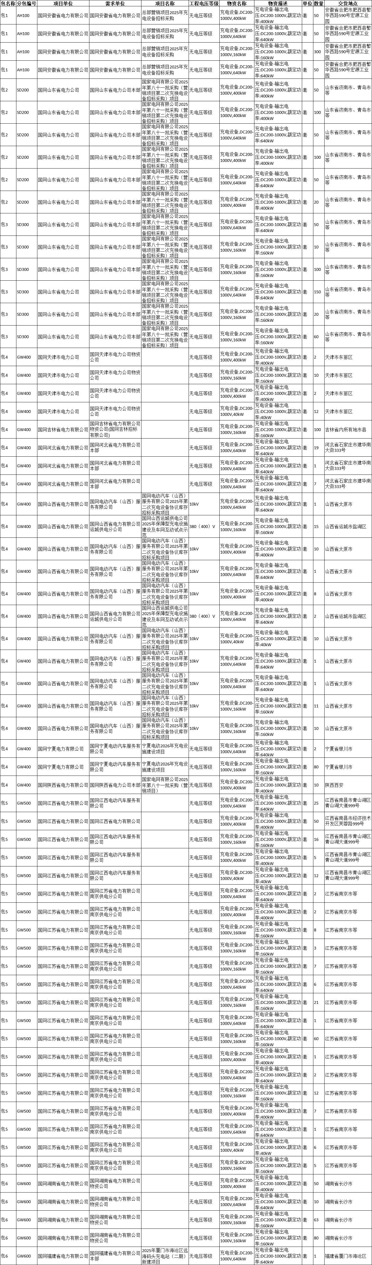 10月17日,国家电网有限公司2025年第八十一批采购(营销项目第二次充换电设备招标采购)招标公告发布。本次招标共包含6个标包,主要聚焦直流充电设备,涵盖四种功率型号,包括640kW、400kW、160kW以及40kW,设备总数达到1981套(后附货物清单),其中640kW充电设备483套、400kW充电设备467套、160kW充电设备991套、40kW充电设备40套。需求省份涉及安徽、山东、天津、吉林、河北、山西、宁夏、陕西、江西、江苏、湖南、福建。