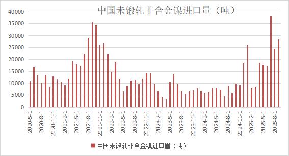 据海关数据显示,中国2025年9月精炼镍进口量为28,570.87吨,环比增加16.97%,同比上升397.76%。2025年1-9月,中国精炼镍累计进口量18.72万吨,同比增加202.5%。