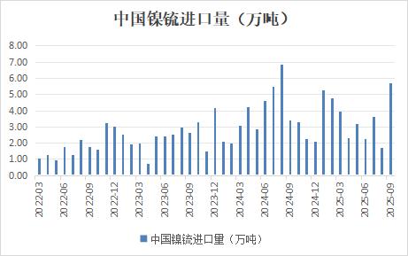 据中国海关数据统计,2025年9月中国镍锍进口量5.68万吨,环比增加3.99万吨,增幅236.43%;同比增加2.26万吨,增幅65.93%。其中自印度尼西亚进口量为5.56万吨,环比增加239.36%,占本月进口量的97.93%。2025年1-9月镍锍进口总量32.68万吨,同比减少3.99%。