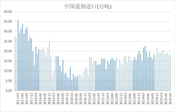 海关总署在线查询数据显示,中国9月废铜进口量为18.41万吨,环比增加2.6%,同比增加14.8%,1-9月中国废铜进口量169.9万吨,同比增加1.4%。9月主要废铜进口来源国分别为日本、泰国、韩国、马来西亚。
