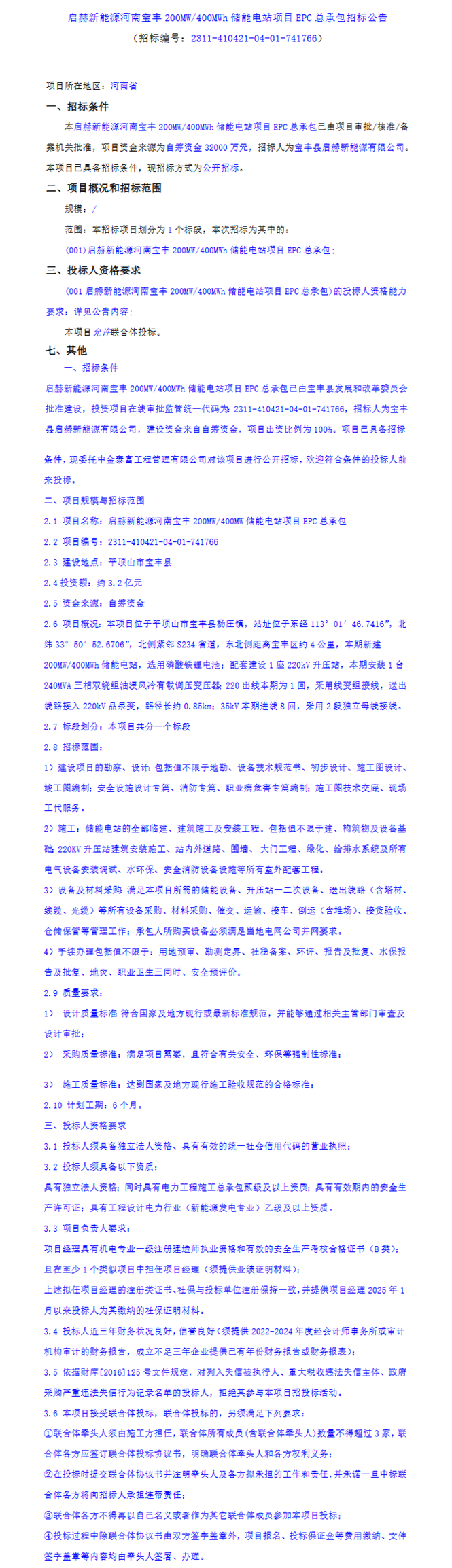 北极星储能网讯:宝丰县启赫新能源有限公司发布河南宝丰200MW/400MWh储能EPC招标公告,项目资金来源为自筹资金32000万元,约合单价0.8元/Wh,项目位于河南平顶山。