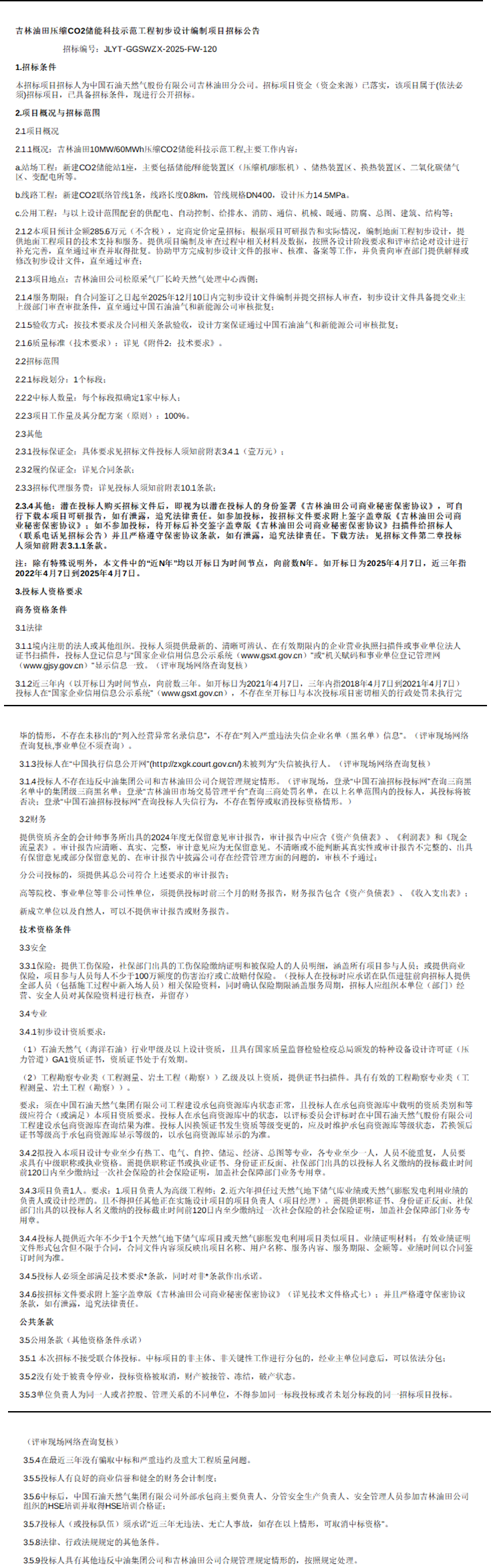 北极星储能网讯:10月21日,中国石油电子招投标交易平台发布《吉林油田压缩CO2储能科技示范工程初步设计编制项目招标公告》,招标人为中国石油天然气股份有限公司吉林油田分公司。
