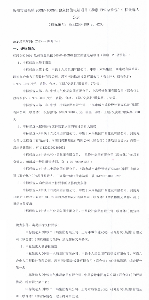 第一中标候选人为中铁十六局集团有限公司、中铁十六局集团广西建设有限公司、河南九合电力工程设计有限公司、河南同兴勘测设计有限公司联合体,投标报价40999.946万元,折合单价1.025元/Wh;