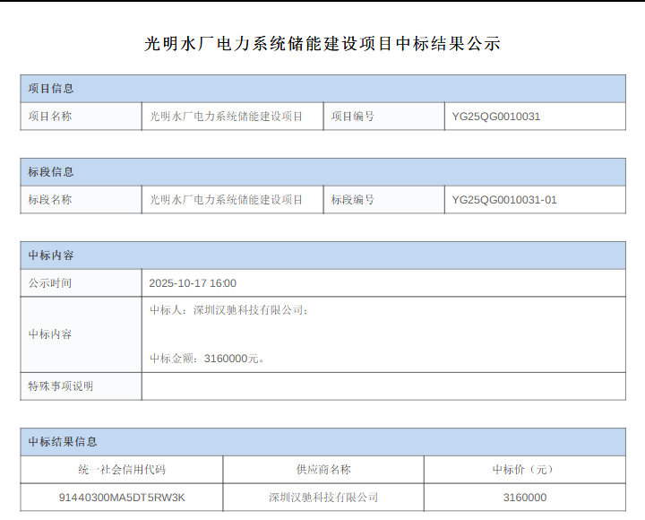 北极星储能网获悉,近日,深圳市光明水厂电力系统储能建设项目中标结果公示。公示结果显示,该项目中标人为深圳汉驰科技有限公司,中标金额为316万元。