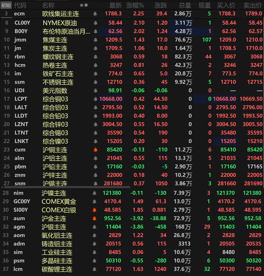 此外,碳酸锂涨1.63%,工业硅涨0.06%,多晶硅跌0.55%。欧线集运主连涨2.25%报1788.3。