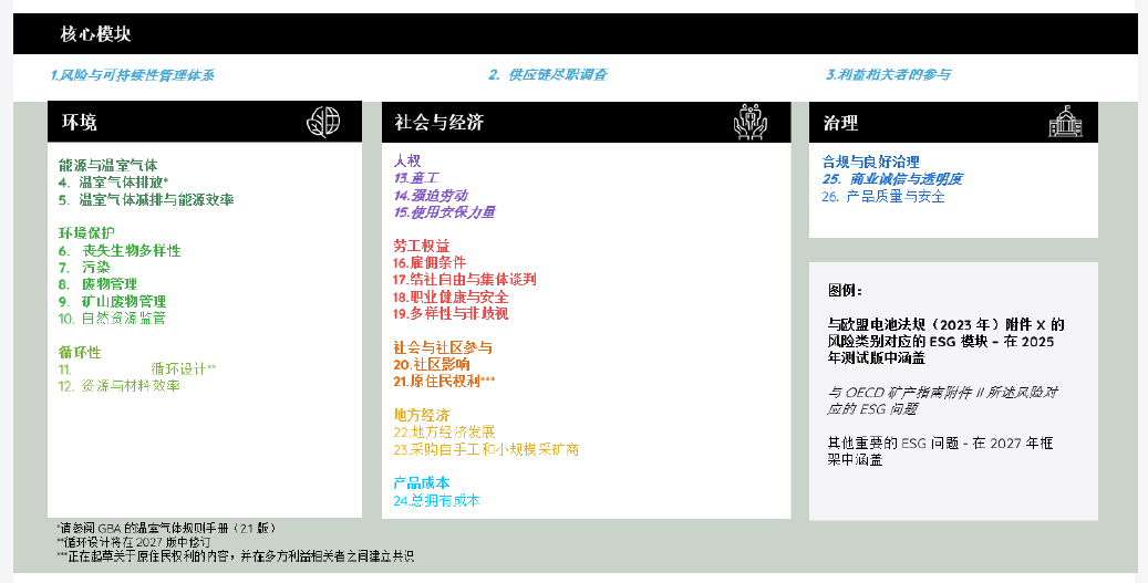 涵盖18 个与国际法规(例如,欧盟电池法规,以及OECD 关于矿产尽职调查与负责任商业行为的指导)对接的ESG 问题;