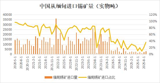 据最新海关总署数据显示,中国2025年9月锡矿砂及其精矿进口量8713.60实物吨(折合约3444.62金属吨)同比下降11.87%,环比下降26.59%,创年内新低。1-9月累计进口约9.14万实物吨,月累计同比下降0.11%。