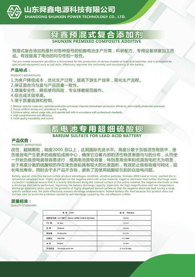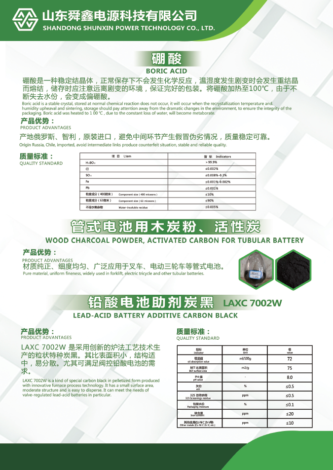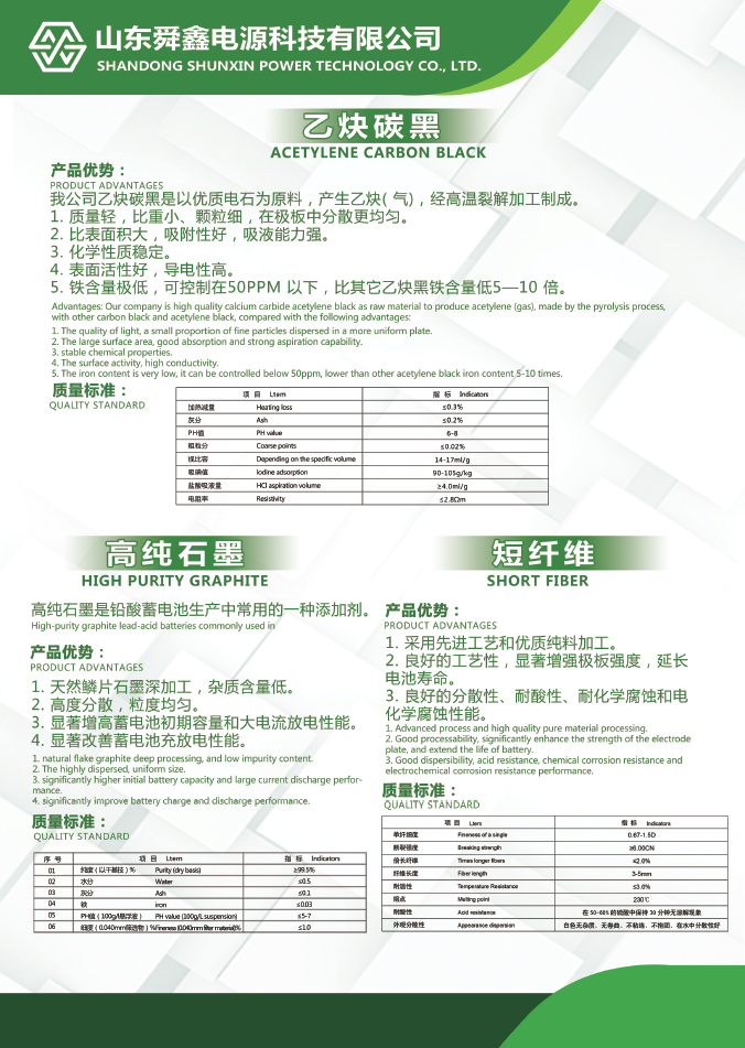 The company is located in the picturesque aviation city of Jinan! Laiwu National High-tech Zone Fine Chemical Industry Park, high-tech and specialized, refined, distinctive and innovative enterprises. Since its establishment in Zibo in 1998, the company has built a production base with an annual output of 10,000 tons of humic acid and 5,000 tons of Shunxin lignin over the past two decades! Meanwhile, the company's products such as short fibers, graphite and carbon black are sold well both at home and abroad, and long-term cooperative relationships have been established with customers. The company's independently developed premixed formula packages cover various fields such as power, energy storage, and starting. Their outstanding performance has helped solve customers' technical problems such as low-temperature discharge, charging reception, and high-power discharge. While looking forward to the rapid development of storage batteries, in order to provide more satisfactory service to customers, Shunxin Power strictly controls the production process, strictly controls the quality, strives for excellence, and endeavors to create first-class quality among similar products! Shunxin Power Supply adheres to the moral philosophy of honest cooperation and carrying all things with virtue, and joins hands with new and old customers to create a brilliant future together!