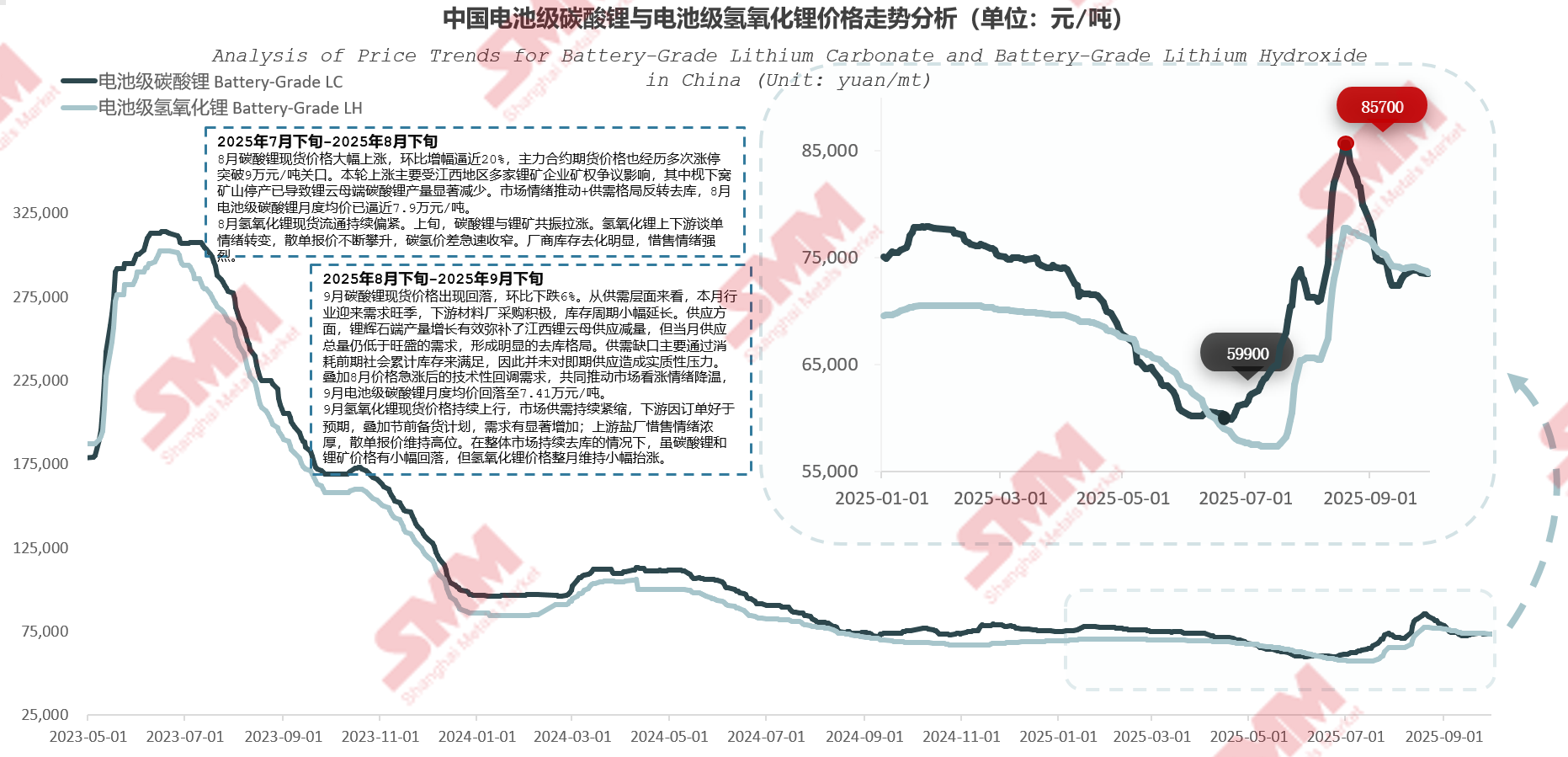 而随着“金九银十”的消费旺季到来,需求的快速增长,带动碳酸锂市场形成明显的去库格局,SMM预计,2025年9~12月份,国内碳酸锂市场或均呈现供应紧缺的态势,有望对碳酸锂价格形成一定支撑。
