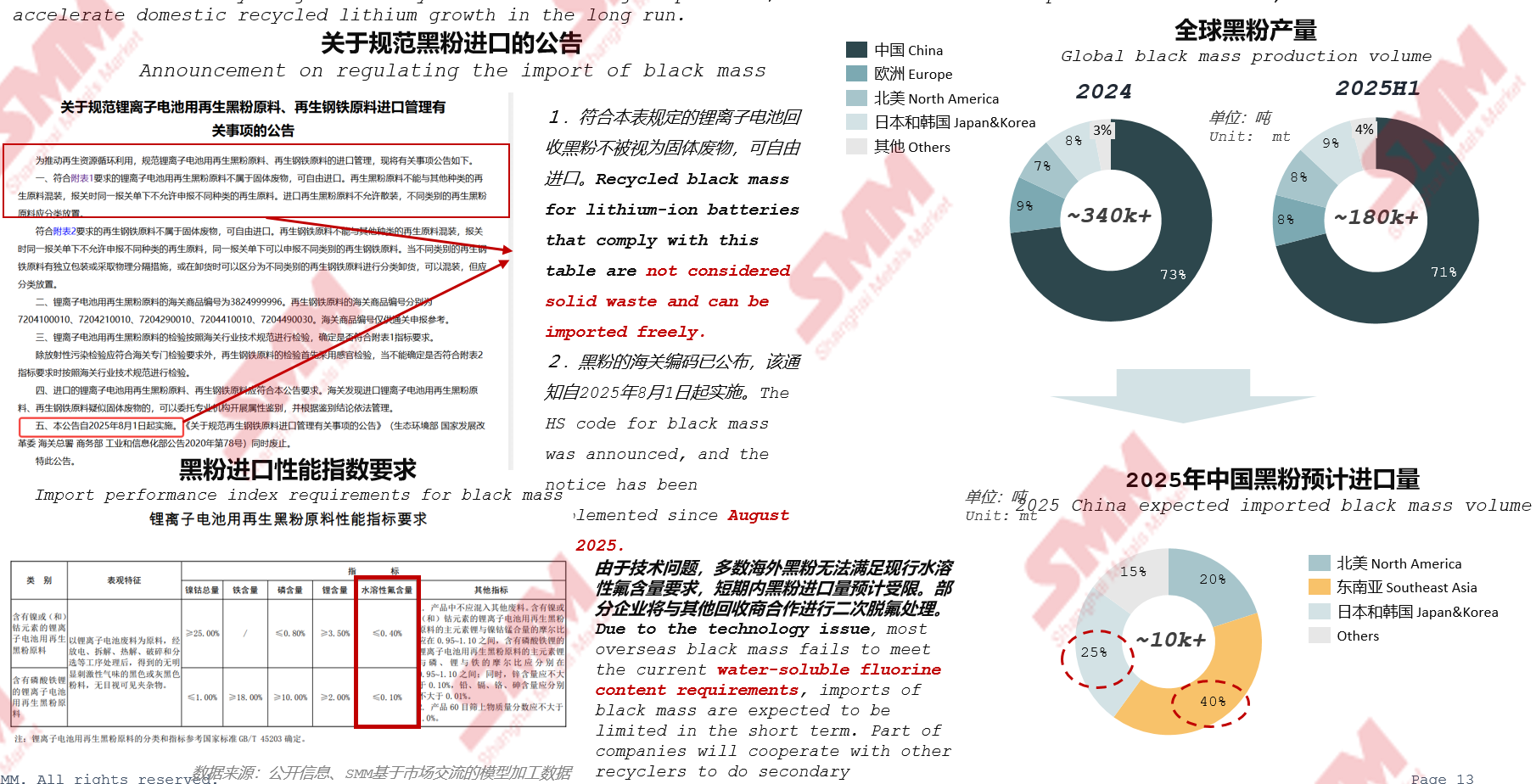 2025年中国放宽对黑粉进出口的限制,以提高资源回收效率并降低对外依存度;长期将加速国内回收锂产业发展