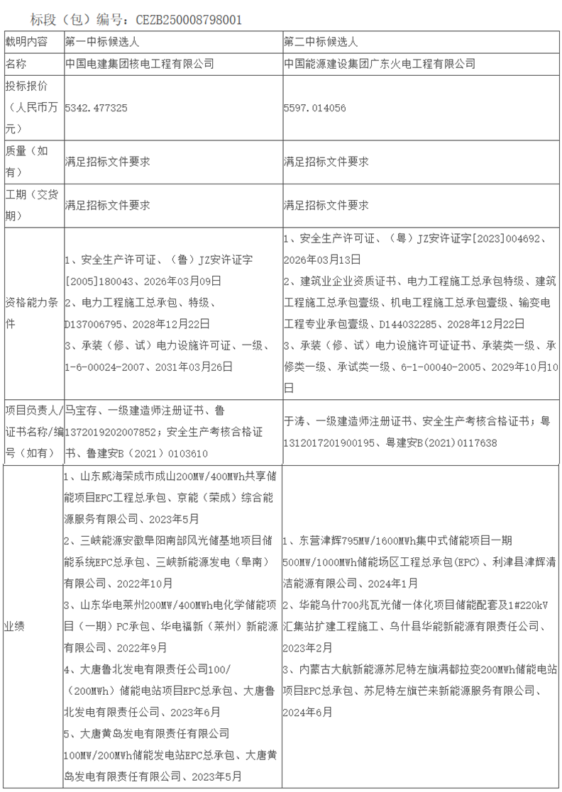 10月20日,龙源电力茫崖龙源新能源有限公司125MW/500MWh电化学储能项目PC总承包公开招标项目中标候选人公示。第一中标候选人为中国电建集团核电工程有限公司,投标报价5342.477325万元;第二中标候选人为中国能源建设集团广东火电工程有限公司,投标报价5597.014056万元。