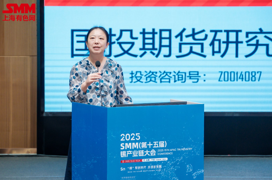 10月24日,在由上海有色网信息科技股份有限公司(SMM)、山东爱思信息科技有限公司以及个旧市产业开发集团有限公司联合主办,云南锡业股份有限公司特邀协办,JFX雅加达期货交易所作为战略合作伙伴,AETI印尼锡出口协会作为协会合作伙伴,广西华锡有色金属股份有限公司、个旧市千岛金属有限公司、惠州联熙电子科技有限公司、红河永森矿业有限公司、上海清算所作为支持单位支持的2025 SMM(第十五届)锡产业链大会上,国投期货有限公司有色金属首席研究员肖静分享了“期货市场在增强锡供应链韧性中的作用”。